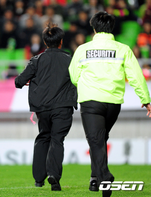 조광래 감독이 이끄는 축구대표팀이 11일 오후 수원월드컵경기장에서 아랍에미리트연합(UAE)와 2014 브라질 월드컵 아시아지역 3차예선 B조 3차전을 가졌다. 후반 한 팬이 경기장에 난입 경비가 쫓아가고 있다. 1승1무를 기록하고 있는 대표팀은 향후 중동 2경기 원정(UAE-레바논)의 부담감을 덜기 위해 반드시 승리해야 하는 상황이다. 조광래 감독은 공격진에 구자철-기성용-이용래로 이어지는 삼각형 미드필더에 박주영과 지동원, '조커' 이동국을 내세워 대량 득점을 노리고 있다. /spjj@osen.co.kr