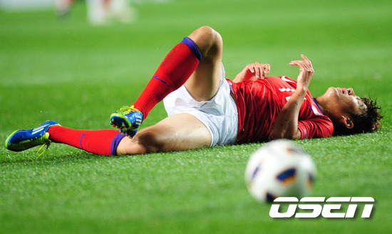 '캡틴박' 박주영(26, 아스날)이 A매치 3경기 연속골로 축구 대표팀에 승리를 안겼다. 후반 손흥민이 UAE 태클에 걸려 넘어져 있다. 조광래 감독이 지휘하는 한국 축구대표팀은 11일 수원 월드컵경기장서 열린 아랍에미리트연합(UAE)와 2014년 브라질 월드컵 아시아지역 3차예선 B조 3차전에서 박주영의 선제골과 상대 수비의 자책골에 힘입어 2-1 승리를 거뒀다. 이로써 한국은 최근 2경기 무승부의 부진을 씻어내고 승리를 차지하며 다음달 예정된 중동 원정 2경기(UAE-레바논)를 상승세로 맞이할 수 있게 됐다. 또한 한국은 B조에서 2승 1무를 기록하며 선두를 달렸다. 한국은 2위 쿠웨이트가 밤 11시(한국시간)에 열리는 레바논과 경기서 6골차로 이기지 않는 이상 1위를 지킨다. /spjj@osen.co.kr