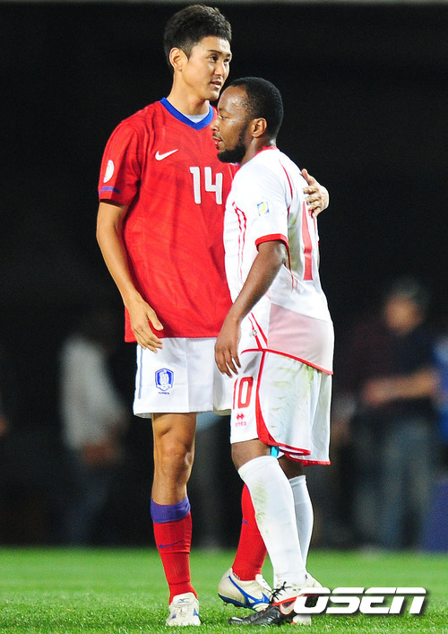 조광래 감독이 지휘하는 한국 축구대표팀이 11일 수원 월드컵경기장서 열린 아랍에미리트연합(UAE)와 2014년 브라질 월드컵 아시아지역 3차예선 B조 3차전에서 박주영의 선제골과 상대 수비의 자책골에 힘입어 2-1 승리를 거뒀다. 이로써 한국은 최근 2경기 무승부의 부진을 씻어내고 승리를 차지하며 다음달 예정된 중동 원정 2경기(UAE-레바논)를 상승세로 맞이할 수 있게 됐다. 또한 한국은 B조에서 2승 1무를 기록하며 선두를 달렸다. 한국은 2위 쿠웨이트가 밤 11시(한국시간)에 열리는 레바논과 경기서 6골차로 이기지 않는 이상 1위를 지킨다. 경기 후 이정수가 UAE 골잡이 이스마일 마타르와 인사를 나누고 있다. /spjj@osen.co.kr