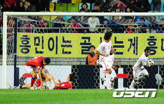 조광래 감독이 지휘하는 한국 축구대표팀이 11일 수원 월드컵경기장서 열린 아랍에미리트연합(UAE)와 2014년 브라질 월드컵 아시아지역 3차예선 B조 3차전에서 박주영의 선제골과 상대 수비의 자책골에 힘입어 2-1 승리를 거뒀다. 이로써 한국은 최근 2경기 무승부의 부진을 씻어내고 승리를 차지하며 다음달 예정된 중동 원정 2경기(UAE-레바논)를 상승세로 맞이할 수 있게 됐다. 또한 한국은 B조에서 2승 1무를 기록하며 선두를 달렸다. 한국은 2위 쿠웨이트가 밤 11시(한국시간)에 열리는 레바논과 경기서 6골차로 이기지 않는 이상 1위를 지킨다. 후반 한국 수비진이 UAE 이스마일 마타르에 골을 허용하고 아쉬워하고 있다. /jpnews@osen.co.kr