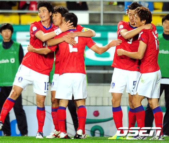 '캡틴박' 박주영(26, 아스날)이 A매치 3경기 연속골로 축구 대표팀에 승리를 안겼다. 첫번째 골을 넣은 박주영이 동료들과 기쁨을 나누고 있다. 조광래 감독이 지휘하는 한국 축구대표팀은 11일 수원 월드컵경기장서 열린 아랍에미리트연합(UAE)와 2014년 브라질 월드컵 아시아지역 3차예선 B조 3차전에서 박주영의 선제골과 상대 수비의 자책골에 힘입어 2-1 승리를 거뒀다. 이로써 한국은 최근 2경기 무승부의 부진을 씻어내고 승리를 차지하며 다음달 예정된 중동 원정 2경기(UAE-레바논)를 상승세로 맞이할 수 있게 됐다. 또한 한국은 B조에서 2승 1무를 기록하며 선두를 달렸다. 한국은 2위 쿠웨이트가 밤 11시(한국시간)에 열리는 레바논과 경기서 6골차로 이기지 않는 이상 1위를 지킨다. /spjj@osen.co.kr