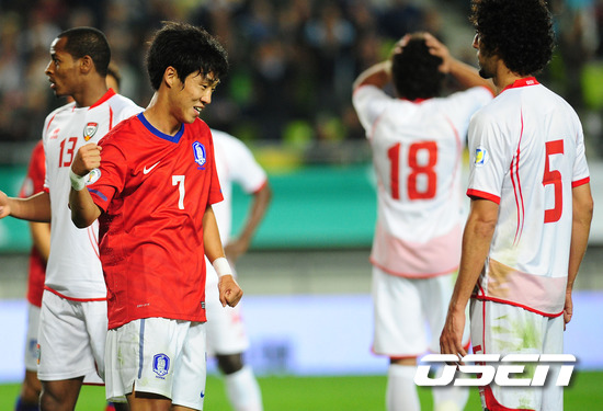 조광래 감독이 지휘하는 한국 축구대표팀이 11일 수원 월드컵경기장서 열린 아랍에미리트연합(UAE)와 2014년 브라질 월드컵 아시아지역 3차예선 B조 3차전에서 박주영의 선제골과 상대 수비의 자책골에 힘입어 2-1 승리를 거뒀다. 이로써 한국은 최근 2경기 무승부의 부진을 씻어내고 승리를 차지하며 다음달 예정된 중동 원정 2경기(UAE-레바논)를 상승세로 맞이할 수 있게 됐다. 또한 한국은 B조에서 2승 1무를 기록하며 선두를 달렸다. 한국은 2위 쿠웨이트가 밤 11시(한국시간)에 열리는 레바논과 경기서 6골차로 이기지 않는 이상 1위를 지킨다. 후반 한국 서정진이 UAE의 자책골에 주먹을 불끈쥐며 기뻐하고 있다. /jpnews@osen.co.kr