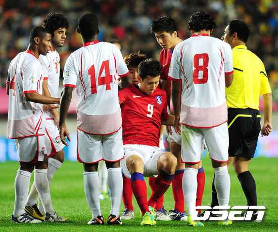 조광래 감독이 지휘하는 한국 축구대표팀이 11일 수원 월드컵경기장서 열린 아랍에미리트연합(UAE)와 2014년 브라질 월드컵 아시아지역 3차예선 B조 3차전에서 박주영의 선제골과 상대 수비의 자책골에 힘입어 2-1 승리를 거뒀다. 이로써 한국은 최근 2경기 무승부의 부진을 씻어내고 승리를 차지하며 다음달 예정된 중동 원정 2경기(UAE-레바논)를 상승세로 맞이할 수 있게 됐다. 또한 한국은 B조에서 2승 1무를 기록하며 선두를 달렸다. 한국은 2위 쿠웨이트가 밤 11시(한국시간)에 열리는 레바논과 경기서 6골차로 이기지 않는 이상 1위를 지킨다. 후반 한국 지동원이 동료선수들의 부축을 받으며 일어서고 있다. /jpnews@osen.co.kr