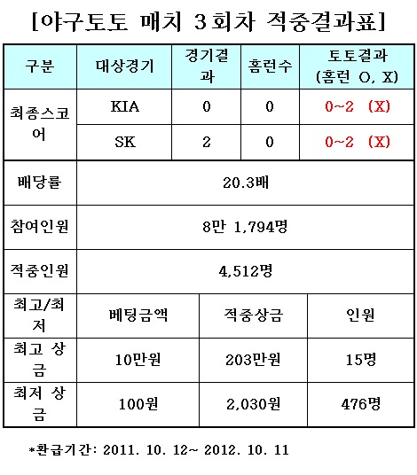 [야구토토] KIA와 SK전을 대상으로 한 야구토토 매치 3회차에서 총 4512명의 적중자가 나왔다. 체육진흥투표권 수탁사업자인 스포츠토토(www.sportstoto.co.kr)는 지난 11일 광주 무등야구장에서 벌어진 KIA와 SK의 2011프로야구 준플레이오프 3차전을 대상으로 한 야구토토 매치 3회차 게임에서 총 4512명의 적중자가 나와 각각 구입금액의 20.3배에 해당하는 적중상금을 받아가게 됐다고 밝혔다. 야구토토매치 게임은 한국야구위원회 주최경기 및 해외에서 개최되는 주요경기를 대상으로 대상경기의 홈런의 O/X (O:홈런이 1개 이상일 경우/ X:홈런이 0개일 경우)와 최종점수대(0~2, 3~4, 5~6, 7~8, 9~10, 11점이상/연장전포함)를 예상해 맞히는 방식으로 진행된다. 이번 야구토토 매치에서 KIA 0~2점대, SK 0~2점대, KIA 홈런(X), SK 홈런(X) 등의 결과를 정확히 예측한 이들 적중자 가운데 10만원을 베팅한 15명의 야구팬들은 이번 회차 최고액인 203만원의 적중상금을 받아가게 됐고, 최소 베팅액인 100원을 베팅한 476명에게는 각각 2030원씩 지급된다.
