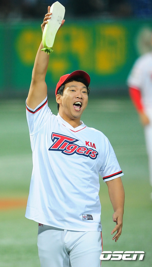 '2011 롯데카드 프로야구' KIA 타이거즈와 SK 와이번스의 준플레이오프 4차전이 12일 오후 광주 무등 야구장에서 열렸다. 경기 전 코미디언 박준형이 승리기원 시구를 마친 후 무를 들어보이고 있다. 준플레이오프 4차전에서는 KIA 타이거즈의 에이스 윤석민과 SK 와이번스의 윤희상이 맞대결을 펼쳤다. 3선승제의 준플레이오프에서 1승 2패로 벼랑끝에 몰린 KIA는 남은 두경기를 모두 이겨야만 플레이오프에 진출할 수 있는 상황이다. 이에 KIA는 1차전에서 완투승을 거둔 윤석민이 3일 휴식 후 바로 선발 등판시켰다. 시리즈 전적 1승2패로 몰린 KIA의 경우 윤석민의 등판 시점을 하루 앞당겼다. 조 감독의 얼쩔 수 없는 무리수다. 한편 SK는 이만수 감독대행은 5차전에서 에이스 김광현을 등판시키기로 했다. 2승1패로 앞선 만큼 4차전을 내주더라도 5차전에서 에이스 김광현을 투입해 승리할 수 있다는 자신감을 보여줬다. 지난 1~3차전에서 보여주듯 철저한 투수전 양상으로 흐르는 준플레이오프에서 SK는 강점인 불펜의 힘을 극대화 하고, KIA는 불펜의 약점을 얼마나 상쇄할 수 있느냐가 관건이다. 또 양 팀 모두 극도의 빈타에서 탈출해야 한다. 앞서 SK는 시즌 종반 김성근 전 감독의 사퇴로 내홍을 앓았고 KIA는 시즌 중반 1위에서 4위로 떨어지는 심각한 성적 하락을 겪은 바 있다. 한편 프로야구 준플레이오프는 5전 3선승제로 진행된다. 8~9일 인천 문학구장에서 2연전이 진행됐고, 11~12일 광주구장에서 3, 4차전이 이어진다. 4차전까지 승부를 가리지 못하면 14일 문학구장으로 돌아와 최종전을 벌인다. / rumi@osen.co.kr