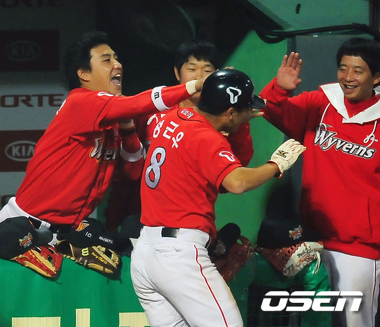 '2011 롯데카드 프로야구' KIA 타이거즈와 SK 와이번스의 준플레이오프 4차전이 12일 오후 광주 무등 야구장에서 열렸다. 3회초 1사 주자 1,2루 SK 최정의 좌익수 뒤 2타점 적시타때 홈을 밟은 박재상과 정근우를 덕아웃에서 동료들과 기쁨을 나누고 있다. . 준플레이오프 4차전에서는 KIA 타이거즈의 에이스 윤석민과 SK 와이번스의 윤희상이 맞대결을 펼쳤다. 3선승제의 준플레이오프에서 1승 2패로 벼랑끝에 몰린 KIA는 남은 두경기를 모두 이겨야만 플레이오프에 진출할 수 있는 상황이다. 이에 KIA는 1차전에서 완투승을 거둔 윤석민이 3일 휴식 후 바로 선발 등판시켰다. 시리즈 전적 1승2패로 몰린 KIA의 경우 윤석민의 등판 시점을 하루 앞당겼다. 조 감독의 얼쩔 수 없는 무리수다. 한편 SK는 이만수 감독대행은 5차전에서 에이스 김광현을 등판시키기로 했다. 2승1패로 앞선 만큼 4차전을 내주더라도 5차전에서 에이스 김광현을 투입해 승리할 수 있다는 자신감을 보여줬다. 지난 1~3차전에서 보여주듯 철저한 투수전 양상으로 흐르는 준플레이오프에서 SK는 강점인 불펜의 힘을 극대화 하고, KIA는 불펜의 약점을 얼마나 상쇄할 수 있느냐가 관건이다. 또 양 팀 모두 극도의 빈타에서 탈출해야 한다. 앞서 SK는 시즌 종반 김성근 전 감독의 사퇴로 내홍을 앓았고 KIA는 시즌 중반 1위에서 4위로 떨어지는 심각한 성적 하락을 겪은 바 있다. 한편 프로야구 준플레이오프는 5전 3선승제로 진행된다. 8~9일 인천 문학구장에서 2연전이 진행됐고, 11~12일 광주구장에서 3, 4차전이 이어진다. 4차전까지 승부를 가리지 못하면 14일 문학구장으로 돌아와 최종전을 벌인다. / rumi@osen.co.kr