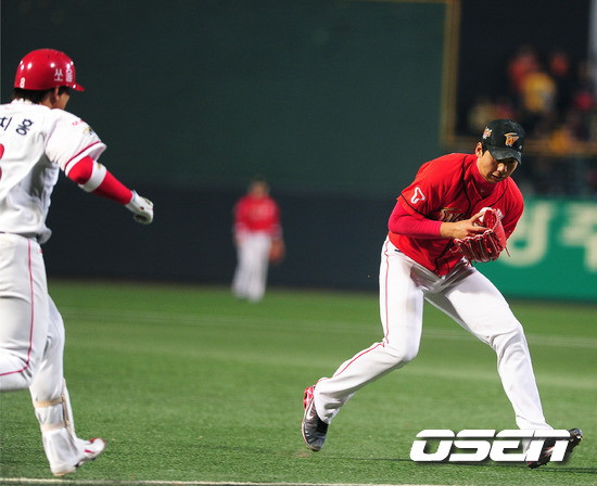 '2011 롯데카드 프로야구' KIA 타이거즈와 SK 와이번스의 준플레이오프 4차전이 12일 오후 광주 무등 야구장에서 열렸다. 4회말 선두타자 안치홍의 투수앞 땅볼때 SK 윤희상이 포구하며 아웃처리 시키고 있다. 3선승제의 준플레이오프에서 1승 2패로 벼랑끝에 몰린 KIA는 남은 두경기를 모두 이겨야만 플레이오프에 진출할 수 있는 상황이다. 이에 KIA는 1차전에서 완투승을 거둔 윤석민이 3일 휴식 후 바로 선발 등판시켰다. 시리즈 전적 1승2패로 몰린 KIA의 경우 윤석민의 등판 시점을 하루 앞당겼다. 조 감독의 얼쩔 수 없는 무리수다. 한편 SK는 이만수 감독대행은 5차전에서 에이스 김광현을 등판시키기로 했다. 2승1패로 앞선 만큼 4차전을 내주더라도 5차전에서 에이스 김광현을 투입해 승리할 수 있다는 자신감을 보여줬다. 지난 1~3차전에서 보여주듯 철저한 투수전 양상으로 흐르는 준플레이오프에서 SK는 강점인 불펜의 힘을 극대화 하고, KIA는 불펜의 약점을 얼마나 상쇄할 수 있느냐가 관건이다. 또 양 팀 모두 극도의 빈타에서 탈출해야 한다. 앞서 SK는 시즌 종반 김성근 전 감독의 사퇴로 내홍을 앓았고 KIA는 시즌 중반 1위에서 4위로 떨어지는 심각한 성적 하락을 겪은 바 있다. 한편 프로야구 준플레이오프는 5전 3선승제로 진행된다. 8~9일 인천 문학구장에서 2연전이 진행됐고, 11~12일 광주구장에서 3, 4차전이 이어진다. 4차전까지 승부를 가리지 못하면 14일 문학구장으로 돌아와 최종전을 벌인다. / ajyoung@osen.co.kr