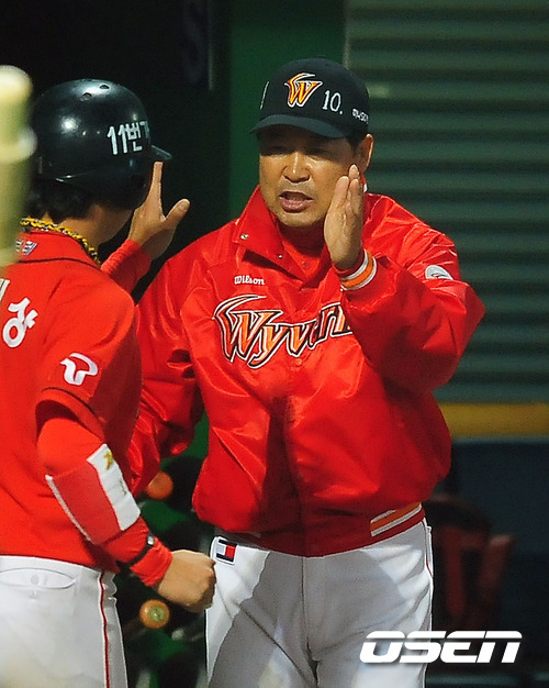 '2011 롯데카드 프로야구' KIA 타이거즈와 SK 와이번스의 준플레이오프 4차전이 12일 오후 광주 무등 야구장에서 열렸다. 5회초 무사 주자 1,3루 박정권이 2루수 앞 땅볼때 홈을 밟은 박재상이 SK 이만수 감독 대행과 덕아웃에서 하이파이브를 하고 있다. 준플레이오프 4차전에서는 KIA 타이거즈의 에이스 윤석민과 SK 와이번스의 윤희상이 맞대결을 펼쳤다. 3선승제의 준플레이오프에서 1승 2패로 벼랑끝에 몰린 KIA는 남은 두경기를 모두 이겨야만 플레이오프에 진출할 수 있는 상황이다. 이에 KIA는 1차전에서 완투승을 거둔 윤석민이 3일 휴식 후 바로 선발 등판시켰다. 시리즈 전적 1승2패로 몰린 KIA의 경우 윤석민의 등판 시점을 하루 앞당겼다. 조 감독의 얼쩔 수 없는 무리수다. 한편 SK는 이만수 감독대행은 5차전에서 에이스 김광현을 등판시키기로 했다. 2승1패로 앞선 만큼 4차전을 내주더라도 5차전에서 에이스 김광현을 투입해 승리할 수 있다는 자신감을 보여줬다. 지난 1~3차전에서 보여주듯 철저한 투수전 양상으로 흐르는 준플레이오프에서 SK는 강점인 불펜의 힘을 극대화 하고, KIA는 불펜의 약점을 얼마나 상쇄할 수 있느냐가 관건이다. 또 양 팀 모두 극도의 빈타에서 탈출해야 한다. 앞서 SK는 시즌 종반 김성근 전 감독의 사퇴로 내홍을 앓았고 KIA는 시즌 중반 1위에서 4위로 떨어지는 심각한 성적 하락을 겪은 바 있다. 한편 프로야구 준플레이오프는 5전 3선승제로 진행된다. 8~9일 인천 문학구장에서 2연전이 진행됐고, 11~12일 광주구장에서 3, 4차전이 이어진다. 4차전까지 승부를 가리지 못하면 14일 문학구장으로 돌아와 최종전을 벌인다. / rumi@osen.co.kr