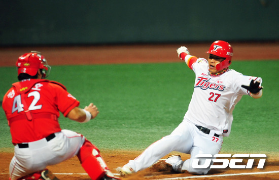 '2011 롯데카드 프로야구' KIA 타이거즈와 SK 와이번스의 준플레이오프 4차전이 12일 오후 광주 무등 야구장에서 열렸다. 6회말 2사 주자 1,2루 KIA 차일목의 우익수 앞 1루타때 2루 주자 김상현이 홈으로 몸을 날리고 있다. 준플레이오프 4차전에서는 KIA 타이거즈의 에이스 윤석민과 SK 와이번스의 윤희상이 맞대결을 펼쳤다. 3선승제의 준플레이오프에서 1승 2패로 벼랑끝에 몰린 KIA는 남은 두경기를 모두 이겨야만 플레이오프에 진출할 수 있는 상황이다. 이에 KIA는 1차전에서 완투승을 거둔 윤석민이 3일 휴식 후 바로 선발 등판시켰다. 시리즈 전적 1승2패로 몰린 KIA의 경우 윤석민의 등판 시점을 하루 앞당겼다. 조 감독의 얼쩔 수 없는 무리수다. 한편 SK는 이만수 감독대행은 5차전에서 에이스 김광현을 등판시키기로 했다. 2승1패로 앞선 만큼 4차전을 내주더라도 5차전에서 에이스 김광현을 투입해 승리할 수 있다는 자신감을 보여줬다. 지난 1~3차전에서 보여주듯 철저한 투수전 양상으로 흐르는 준플레이오프에서 SK는 강점인 불펜의 힘을 극대화 하고, KIA는 불펜의 약점을 얼마나 상쇄할 수 있느냐가 관건이다. 또 양 팀 모두 극도의 빈타에서 탈출해야 한다. 앞서 SK는 시즌 종반 김성근 전 감독의 사퇴로 내홍을 앓았고 KIA는 시즌 중반 1위에서 4위로 떨어지는 심각한 성적 하락을 겪은 바 있다. 한편 프로야구 준플레이오프는 5전 3선승제로 진행된다. 8~9일 인천 문학구장에서 2연전이 진행됐고, 11~12일 광주구장에서 3, 4차전이 이어진다. 4차전까지 승부를 가리지 못하면 14일 문학구장으로 돌아와 최종전을 벌인다. / rumi@osen.co.kr