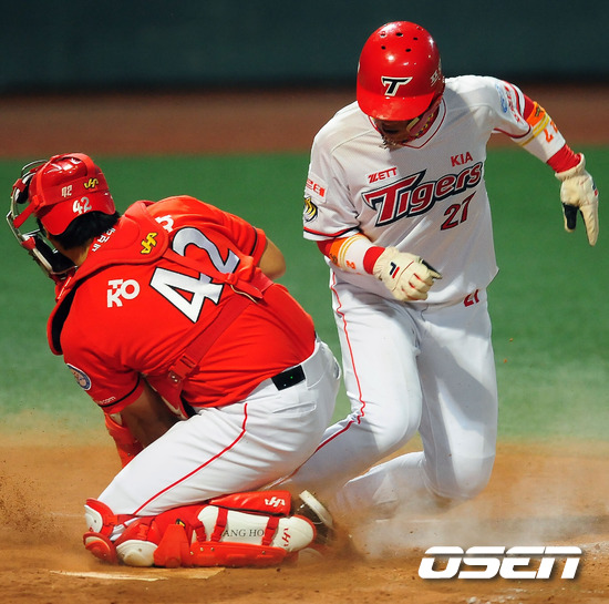 '2011 롯데카드 프로야구' KIA 타이거즈와 SK 와이번스의 준플레이오프 4차전이 12일 오후 광주 무등 야구장에서 열렸다. 6회말 2사 주자 1,2루 KIA 차일목의 우익수 앞 1루타때 2루 주자 김상현이 홈으로 몸을 날렸으나 SK 정상호 포수에게 태그아웃 당하고 있다. 준플레이오프 4차전에서는 KIA 타이거즈의 에이스 윤석민과 SK 와이번스의 윤희상이 맞대결을 펼쳤다. 3선승제의 준플레이오프에서 1승 2패로 벼랑끝에 몰린 KIA는 남은 두경기를 모두 이겨야만 플레이오프에 진출할 수 있는 상황이다. 이에 KIA는 1차전에서 완투승을 거둔 윤석민이 3일 휴식 후 바로 선발 등판시켰다. 시리즈 전적 1승2패로 몰린 KIA의 경우 윤석민의 등판 시점을 하루 앞당겼다. 조 감독의 얼쩔 수 없는 무리수다. 한편 SK는 이만수 감독대행은 5차전에서 에이스 김광현을 등판시키기로 했다. 2승1패로 앞선 만큼 4차전을 내주더라도 5차전에서 에이스 김광현을 투입해 승리할 수 있다는 자신감을 보여줬다. 지난 1~3차전에서 보여주듯 철저한 투수전 양상으로 흐르는 준플레이오프에서 SK는 강점인 불펜의 힘을 극대화 하고, KIA는 불펜의 약점을 얼마나 상쇄할 수 있느냐가 관건이다. 또 양 팀 모두 극도의 빈타에서 탈출해야 한다. 앞서 SK는 시즌 종반 김성근 전 감독의 사퇴로 내홍을 앓았고 KIA는 시즌 중반 1위에서 4위로 떨어지는 심각한 성적 하락을 겪은 바 있다. 한편 프로야구 준플레이오프는 5전 3선승제로 진행된다. 8~9일 인천 문학구장에서 2연전이 진행됐고, 11~12일 광주구장에서 3, 4차전이 이어진다. 4차전까지 승부를 가리지 못하면 14일 문학구장으로 돌아와 최종전을 벌인다. / rumi@osen.co.kr