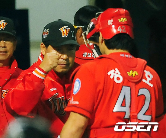 '2011 롯데카드 프로야구' KIA 타이거즈와 SK 와이번스의 준플레이오프 4차전이 12일 오후 광주 무등 야구장에서 열렸다. 6회말 2사 주자 1,2루 KIA 차일목의 우익수 앞 1루타때 2루 주자 김상현이 홈으로 몸을 날렸으나 SK 정상호 포수에게 태그아웃 당했다. 덕아웃으로 들어오는 정상호와 SK 이만수 감독 대행이 하이파이브를 하고 있다. 준플레이오프 4차전에서는 KIA 타이거즈의 에이스 윤석민과 SK 와이번스의 윤희상이 맞대결을 펼쳤다. 3선승제의 준플레이오프에서 1승 2패로 벼랑끝에 몰린 KIA는 남은 두경기를 모두 이겨야만 플레이오프에 진출할 수 있는 상황이다. 이에 KIA는 1차전에서 완투승을 거둔 윤석민이 3일 휴식 후 바로 선발 등판시켰다. 시리즈 전적 1승2패로 몰린 KIA의 경우 윤석민의 등판 시점을 하루 앞당겼다. 조 감독의 어쩔 수 없는 무리수다. 한편 SK는 이만수 감독대행은 5차전에서 에이스 김광현을 등판시키기로 했다. 2승1패로 앞선 만큼 4차전을 내주더라도 5차전에서 에이스 김광현을 투입해 승리할 수 있다는 자신감을 보여줬다. 지난 1~3차전에서 보여주듯 철저한 투수전 양상으로 흐르는 준플레이오프에서 SK는 강점인 불펜의 힘을 극대화 하고, KIA는 불펜의 약점을 얼마나 상쇄할 수 있느냐가 관건이다. 또 양 팀 모두 극도의 빈타에서 탈출해야 한다. 앞서 SK는 시즌 종반 김성근 전 감독의 사퇴로 내홍을 앓았고 KIA는 시즌 중반 1위에서 4위로 떨어지는 심각한 성적 하락을 겪은 바 있다. 한편 프로야구 준플레이오프는 5전 3선승제로 진행된다. 8~9일 인천 문학구장에서 2연전이 진행됐고, 11~12일 광주구장에서 3, 4차전이 이어진다. 4차전까지 승부를 가리지 못하면 14일 문학구장으로 돌아와 최종전을 벌인다. / rumi@osen.co.kr