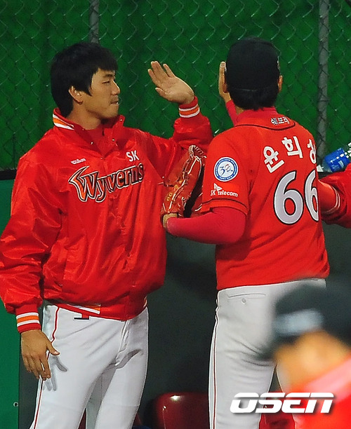 '2011 롯데카드 프로야구' KIA 타이거즈와 SK 와이번스의 준플레이오프 4차전이 12일 오후 광주 무등 야구장에서 열렸다. 7회말 2사 주자 없는 김선빈 타석때 SK 선발 윤희상이 마운드를 내려오며 불펜에서 김광현과 하이파이브를 하고 있다. 준플레이오프 4차전에서는 KIA 타이거즈의 에이스 윤석민과 SK 와이번스의 윤희상이 맞대결을 펼쳤다. 3선승제의 준플레이오프에서 1승 2패로 벼랑끝에 몰린 KIA는 남은 두경기를 모두 이겨야만 플레이오프에 진출할 수 있는 상황이다. 이에 KIA는 1차전에서 완투승을 거둔 윤석민이 3일 휴식 후 바로 선발 등판시켰다. 시리즈 전적 1승2패로 몰린 KIA의 경우 윤석민의 등판 시점을 하루 앞당겼다. 조 감독의 어쩔 수 없는 무리수다. 한편 SK는 이만수 감독대행은 5차전에서 에이스 김광현을 등판시키기로 했다. 2승1패로 앞선 만큼 4차전을 내주더라도 5차전에서 에이스 김광현을 투입해 승리할 수 있다는 자신감을 보여줬다. 지난 1~3차전에서 보여주듯 철저한 투수전 양상으로 흐르는 준플레이오프에서 SK는 강점인 불펜의 힘을 극대화 하고, KIA는 불펜의 약점을 얼마나 상쇄할 수 있느냐가 관건이다. 또 양 팀 모두 극도의 빈타에서 탈출해야 한다. 앞서 SK는 시즌 종반 김성근 전 감독의 사퇴로 내홍을 앓았고 KIA는 시즌 중반 1위에서 4위로 떨어지는 심각한 성적 하락을 겪은 바 있다. 한편 프로야구 준플레이오프는 5전 3선승제로 진행된다. 8~9일 인천 문학구장에서 2연전이 진행됐고, 11~12일 광주구장에서 3, 4차전이 이어진다. 4차전까지 승부를 가리지 못하면 14일 문학구장으로 돌아와 최종전을 벌인다. / rumi@osen.co.kr