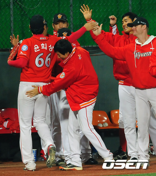 '2011 롯데카드 프로야구' KIA 타이거즈와 SK 와이번스의 준플레이오프 4차전이 12일 오후 광주 무등 야구장에서 열렸다. 7회말 2사 주자 없는 김선빈 타석때 SK 선발 윤희상이 마운드를 내려오며 불펜에서 동료들의 무실점 호투에 대한 축하를 받고 있다. 준플레이오프 4차전에서는 KIA 타이거즈의 에이스 윤석민과 SK 와이번스의 윤희상이 맞대결을 펼쳤다. 3선승제의 준플레이오프에서 1승 2패로 벼랑끝에 몰린 KIA는 남은 두경기를 모두 이겨야만 플레이오프에 진출할 수 있는 상황이다. 이에 KIA는 1차전에서 완투승을 거둔 윤석민이 3일 휴식 후 바로 선발 등판시켰다. 시리즈 전적 1승2패로 몰린 KIA의 경우 윤석민의 등판 시점을 하루 앞당겼다. 조 감독의 어쩔 수 없는 무리수다. 한편 SK는 이만수 감독대행은 5차전에서 에이스 김광현을 등판시키기로 했다. 2승1패로 앞선 만큼 4차전을 내주더라도 5차전에서 에이스 김광현을 투입해 승리할 수 있다는 자신감을 보여줬다. 지난 1~3차전에서 보여주듯 철저한 투수전 양상으로 흐르는 준플레이오프에서 SK는 강점인 불펜의 힘을 극대화 하고, KIA는 불펜의 약점을 얼마나 상쇄할 수 있느냐가 관건이다. 또 양 팀 모두 극도의 빈타에서 탈출해야 한다. 앞서 SK는 시즌 종반 김성근 전 감독의 사퇴로 내홍을 앓았고 KIA는 시즌 중반 1위에서 4위로 떨어지는 심각한 성적 하락을 겪은 바 있다. 한편 프로야구 준플레이오프는 5전 3선승제로 진행된다. 8~9일 인천 문학구장에서 2연전이 진행됐고, 11~12일 광주구장에서 3, 4차전이 이어진다. 4차전까지 승부를 가리지 못하면 14일 문학구장으로 돌아와 최종전을 벌인다. / rumi@osen.co.kr