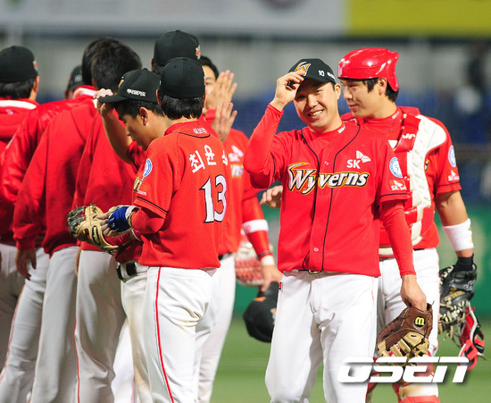 SK 와이번스가 1패 후 3연승, 리버스 스윕으로 플레이오프 진출을 확정지었다. 경기 종료후 선수들이 승리이 기쁨을 나누고 있다. SK는 12일 광주구장에서 열린 2011 롯데카드 프로야구 준플레이오프 4차전 KIA와의 원정경기에서 '히든카드' 선발 윤희상의 무실점 환상투에 4타점을 올린 최정의 결승타 등 장단 13안타를 집중시켜 8-0으로 완승을 거뒀다. 선발 윤희상은 6⅔이닝 동안 6피안타 2볼넷 4탈삼진으로 무실점, 퀄리티스타트로 포스트시즌 첫 출장에서 승리를 따냈다. 총투구수는 100개. 깜짝 호투로 이날 승리의 일등공신이 됐다. 이로써 플레이오프 진출에 성공한 SK는 오는 16일 부산 사직구장에서 2위 롯데와 한국시리즈 진출 티켓을 위한 맞대결에 나선다./ajyoung@osen.co.kr