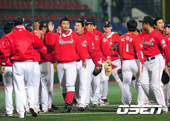 SK 와이번스가 1패 후 3연승, 리버스 스윕으로 플레이오프 진출을 확정지었다. 경기 종료후 선수들이 승리의 기쁨을 나누고 있다. SK는 12일 광주구장에서 열린 2011 롯데카드 프로야구 준플레이오프 4차전 KIA와의 원정경기에서 '히든카드' 선발 윤희상의 무실점 환상투에 4타점을 올린 최정의 결승타 등 장단 13안타를 집중시켜 8-0으로 완승을 거뒀다. 선발 윤희상은 6⅔이닝 동안 6피안타 2볼넷 4탈삼진으로 무실점, 퀄리티스타트로 포스트시즌 첫 출장에서 승리를 따냈다. 총투구수는 100개. 깜짝 호투로 이날 승리의 일등공신이 됐다. 이로써 플레이오프 진출에 성공한 SK는 오는 16일 부산 사직구장에서 2위 롯데와 한국시리즈 진출 티켓을 위한 맞대결에 나선다./ajyoung@osen.co.kr