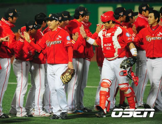 '2011 롯데카드 프로야구' KIA 타이거즈와 SK 와이번스의 준플레이오프 4차전이 12일 오후 광주 무등 야구장에서 열렸다. SK 와이번스가 1패 후 3연승, 리버스 스윕으로 플레이오프 진출을 확정지었다. 경기를 마치고 SK 선수들이 그라운드 위에서 기쁨을 나누고 있다. 이 날 경기에서 '히든카드' 선발 윤희상의 환상투에 4타점을 올린 최정의 결승타 등 장단 13안타를 집중시켜 8-0으로 완승을 거뒀다. 선발 윤희상은 6⅔이닝 동안 6피안타 2볼넷 4탈삼진으로 무실점, 퀄리티스타트로 포스트시즌 첫 출장에서 승리를 따냈다. 총 투구수는 100개. 깜짝 호투로 이날 승리의 일등공신이 됐다. 이로써 이만수 감독대행이 이끄는 SK는 오는 16일 부산 사직구장에서 막을 올리는 2위 롯데와의 한국시리즈 진출 티켓을 건 3선승제 플레이오프에 대비한다. 반면 KIA는 1승 후 내리 3연패, 가을무대에서 쓸쓸하게 퇴장했다. 1차전에서 완투승을 거둔 선발 윤석민을 나흘만에 전격 투입했으나 역부족이었다. 2⅓이닝만에 강판됐다. 4피안타 2볼넷 3탈삼진으로 3실점, 패전투수가 됐다. 특히 전날 0-2 패배에 이어 이날도 득점에 실패한 KIA는 지난 1992년 준플레이오프 삼성, 1994년 플레이오프 삼성 이후 3번째 포스트시즌 2경기 연속 무득점이라는 불명예 기록까지 남겼다. 윤희상 후 나온 정대현, 작은 이승호 공략에 실패했다. / rumi@osen.co.kr