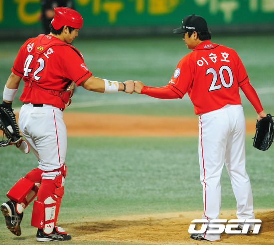 '2011 롯데카드 프로야구' KIA 타이거즈와 SK 와이번스의 준플레이오프 4차전이 12일 오후 광주 무등 야구장에서 열렸다. SK 와이번스가 1패 후 3연승, 리버스 스윕으로 플레이오프 진출을 확정지었다. 경기를 마치고 SK 정상호와 이승호가 기쁨을 나누고 있다. 이 날 경기에서 '히든카드' 선발 윤희상의 환상투에 4타점을 올린 최정의 결승타 등 장단 13안타를 집중시켜 8-0으로 완승을 거뒀다. 선발 윤희상은 6⅔이닝 동안 6피안타 2볼넷 4탈삼진으로 무실점, 퀄리티스타트로 포스트시즌 첫 출장에서 승리를 따냈다. 총 투구수는 100개. 깜짝 호투로 이날 승리의 일등공신이 됐다. 이로써 이만수 감독대행이 이끄는 SK는 오는 16일 부산 사직구장에서 막을 올리는 2위 롯데와의 한국시리즈 진출 티켓을 건 3선승제 플레이오프에 대비한다. 반면 KIA는 1승 후 내리 3연패, 가을무대에서 쓸쓸하게 퇴장했다. 1차전에서 완투승을 거둔 선발 윤석민을 나흘만에 전격 투입했으나 역부족이었다. 2⅓이닝만에 강판됐다. 4피안타 2볼넷 3탈삼진으로 3실점, 패전투수가 됐다. 특히 전날 0-2 패배에 이어 이날도 득점에 실패한 KIA는 지난 1992년 준플레이오프 삼성, 1994년 플레이오프 삼성 이후 3번째 포스트시즌 2경기 연속 무득점이라는 불명예 기록까지 남겼다. 윤희상 후 나온 정대현, 작은 이승호 공략에 실패했다. / rumi@osen.co.kr