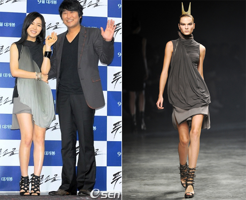 스타들의 레드카펫 패션 못지않게 시사회 패션도 많은 화제가 되고 있다. 평소 여성스럽고 우아한 이미지를 가진 여배우라 하더라도 시사회 패션에서는 독특하거나 파격적인 스타일로 그 동안 꽁꽁 감춰두었던 색다른 매력을 발산한다. 청순함의 대명사로 손꼽히는 배우 신세경과 컬렉션 런웨이 모델이 똑같이 선보인 미니멀한 디자이너 릭 오웬스 아이템이다. 가을과 잘 어울리는 모노톤의 그레이 컬러 톱과 그레이 팬츠로 패션 감각을 뽐낸 패션쇼의 모델은 몽환적인 메이크업과 브라운 컬러 스트랩 힐을 신었고, 독특한 콘셉트의 헤어 액세서리까지 고스 룩 스타일을 완성했다. 반면, 영화 푸른소금 시사회에 참석한 신세경은 몽환적인 미니멀 룩을 여성스럽고 우아한 느낌으로 소화했다. 블랙과 그레이컬러가 믹스된 모노톤의 드레이프 된 여성스러운 톱은 심플하고 미니멀한 느낌의 절제된 핏을 연출해 청순함이 돋보였고, 그레이 컬러의 팬츠의 언밸런스한 길이 감으로 섹시함까지 가미되었다. arainbow@osen.co.kr 릭 오웬스 제공.