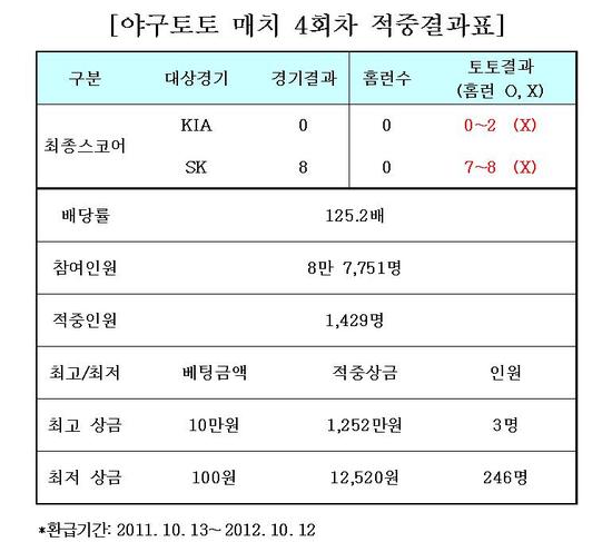 [야구토토] KIA와 SK전을 대상으로 한 야구토토 매치 4회차에서 총 1429명의 적중자가 나왔다. 체육진흥투표권 수탁사업자인 스포츠토토(www.sportstoto.co.kr)는 지난 12일 광주 무등야구장에서 벌어진 KIA와 SK의 2011프로야구 준플레이오프 4차전을 대상으로 한 야구토토 매치 4회차 게임에서 총 1429명의 적중자가 나와 각각 구매금액의 125.2배에 해당하는 적중상금을 받아가게 됐다고 밝혔다. 야구토토매치 게임은 한국야구위원회 주최경기 및 해외에서 개최되는 주요경기를 대상으로 대상경기의 홈런의 O/X (O:홈런이 1개 이상일 경우/ X:홈런이 0개일 경우)와 최종점수대(0~2, 4~4, 5~6, 7~8, 9~10, 11점이상/연장전포함)를 예상하여 맞히는 방식으로 진행된다. 이번 야구토토 매치에서 KIA 0~2점대, SK 7~8점대, KIA 홈런(X), SK 홈런(X) 등의 결과를 정확히 예측한 이들 적중자 가운데 10만원을 베팅한 3명의 야구팬들은 이번 회차 최고액인 1252만원의 적중상금을 받아가게 됐고, 최소 베팅액인 100원을 베팅한 246명에게는 각각 1만2520원씩 지급된다. 스포츠토토 관계자는 "시즌 중반 감독이 교체되며 진통을 앓았던 SK가 1패 뒤 3연승을 기록하며 플레이오프에 진출하게 됐다"며 "롯데와 SK의 플레이오프를 대상으로 이어질 야구토토 매치 게임에도 지속적인 관심과 참여를 기대한다"고 밝혔다. 한편 이어지는 야구토토 매치 5회차는 정규리그 2위 롯데와 KIA를 물리치고 올라온 SK의 플레이오프 전경기를 대상으로 발매되며, 일정이 확정되는 데로 스포츠토토 홈페이지 및 공식 온라인발매사이트 베트맨(www.betman.co.kr)을 통해 공지할 예정이다.