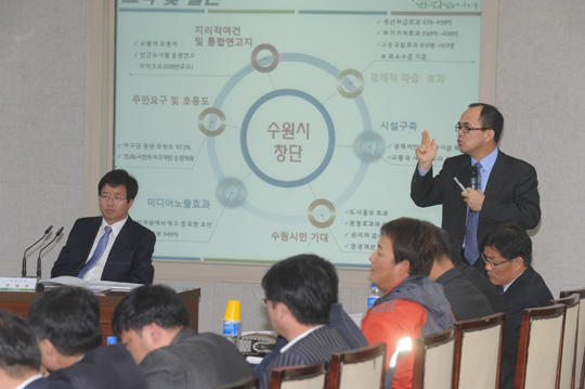 수원시가 프로야구 제10구단을 유치할 경우 경제적 파급효과가 총 1,373억원에 이르는 것으로 조사됐다. 고용파급효과도 1441명으로 나타나 프로야구 유치가 일자리 창출에도 기여할 것으로 분석됐다. 이는 한국은행 산업연관분석을 통한 경제적 효과분석으로 산출한 결과다. 분석은 신생구단과 하위성적구단으로 평균에서 시작한다는 최소규모 분석과 설문조사 등 실증조사를 통한 추정 야구 관중수를 조건으로 했다. 13일 오전 수원시청 중회의실에서 염태영 수원시장을 비롯해 ‘프로야구 제10구단 수원시 유치 추진위원회' 위원들이 참석한 가운데 개최된 ‘수원시 프로야구 10구단 창단(유치)관련 경제효과분석’최종보고회에서 이같이 밝혔다. 수원시가 한양대학교 스포츠산업ㆍ마케팅센터(김종 교수팀)에 의뢰하여 조사한 “수원시 프로야구 10구단 창단(유치)관련 경제효과분석”최종보고회에서 프로야구단은 최소 923억원의 생산유발 효과와 450억원의 부가가치 효과, 그리고 1,441명의 고용유발 효과 등이 발생하여 스포츠 산업으로서 지역경제에 미치는 파급효과가 큰 것으로 나타났다. 더불어 인터넷을 제외한 중계분석, 중계추정치, 신문 및 뉴스분석을 통한 미디어 노출 홍보 효과도 943억원에 이르는 것으로 나타났다. 아울러 한양대학교 스포츠산업ㆍ마케팅센터는 최근 수원시민 552명을 대상으로 실시한 여론조사에서 응답자중 77%는 프로야구 응원활동에 참여하고 있는 것으로 조사되었으며, 97.5%가 수원시 프로야구 창단을 희망하고 있다고 밝혔다. 또한 직접관람 및 직접응원 등의 의사를 밝힌 응답자는 21.8%이며 이들은 실제 관람객으로 이어질 가능성이 있는 것으로 추정된다. 이는 인구 110만명의 수원시민의 22% 가량인 24만2천명이 잠재팬 규모임을 의미한다. 염태영 수원시장은 “최근 650만 관중시대에 국민스포츠로 자리매김한 프로야구단은 연간 수천억원에 달하는 직․간접적인 경제파급효과를 통해 지역경제 활성화에 기여하는 중요한 스포츠산업으로 자리를 잡아가고 있는 추세”라며 “최소한의 비용으로 최대의 효과를 얻을 수 있도록 하고, 시민들에게 볼거리, 즐길거리, 놀거리를 제공하여 유대감 강화에 따른 애향심 고취와 휴먼시티 수원의 도시브랜드 가치 상승효과에도 크게 기여할 수 있도록 프로야구 수원 유치를 위해 시민들과 함께 노력하겠다”고 밝혔다.