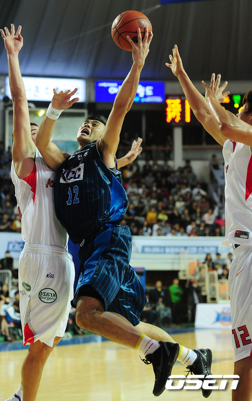 13일 오후 전주체육관에서 열린 '2011-2012 KB국민카드 프로농구' 정규리그 전주 KCC와 서울 SK의 개막전에서 2쿼터 KCC 김태홍이 SK 김민수와 한정원의 블로킹을 뚫고 레이업슛을 날리고 있다. 허재 감독이 지휘하는 KCC는 지난 시즌 디펜딩 챔피언으로서 이번 시즌에도 우승을 노리며 2연패를 꿈꾸고 있다. 이번 개막전에서 KCC는 분명 SK에 비해 전력상 우세를 점하고 있다. 토종 빅맨 하승진이라는 최고의 카드가 있고 가드진에는 최정상급의 선수 전태풍이 있다. 매치업에서 SK에 절대 밀리지 않는 것. 하지만 KCC는 지난 4년 동안 개막전에서 단 한번도 승리하지 못하는 '개막전 징크스'에 빠져 있다. 한편 문경은 감독대행-전희철 코치 체제로 체질개선에 나선 SK는 비록 약체로 지목되고 있지만, SK의 가드진 만큼은 어느 팀에 견줘도 경쟁력이 넘친다. 주희정과 김효범, 변기훈에 신인 김선형까지 가세해 보다 다양한 조합과 패턴을 기대할 수 있게 됐다. KCC가 개막전 징크스를 깨고 승리를 거두며 스타트를 기분 좋게 끊을 수 있을지, 관심거리다. / rumi@osen.co.kr