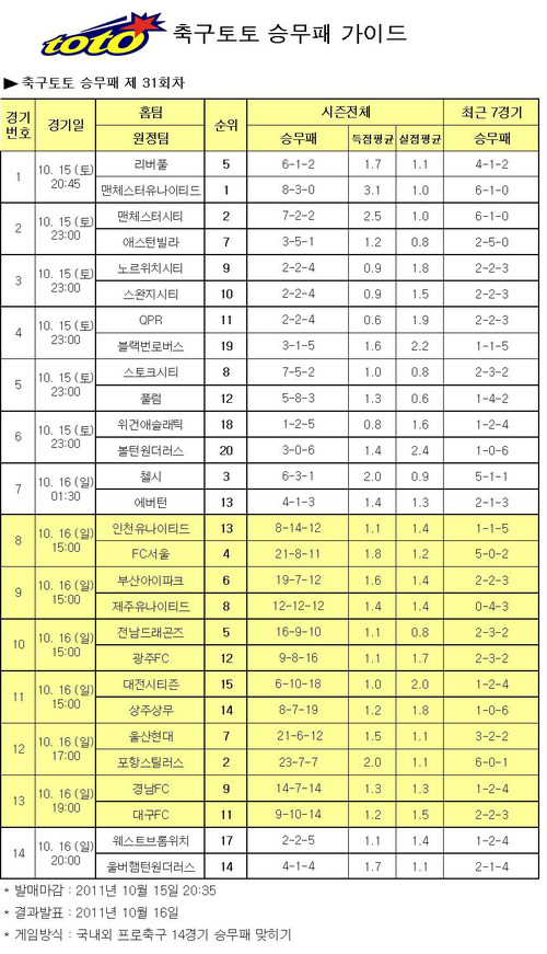 [축구토토] 국민체육진흥공단(www.kspo.or.kr)이 발행하는 체육진흥투표권 수탁사업자인 스포츠토토 온라인 공식 발매사이트 베트맨(www.betman.co.kr)은 15일부터 2일간 벌어지는 K-리그 6경기와 영국프리미어리그(EPL) 8경기 등 총 14경기를 대상으로 한 축구토토 승무패 31회차 투표율 중간집계 결과, 국내 축구팬 52.29%는 박지성이 속한 맨체스터유나이티드가 리버풀을 상대로 승리할 것으로 전망했다. 양 팀 무승부 예상은 25.85%로 집계됐고, 홈팀 리버풀 승리 예상은 21.86%로 나타났다. '레즈 더비'를 펼치는 맨유와 리버풀의 경기에서 박지성의 출전여부가 무엇보다 관심을 끌고 있다. 박지성은 지난해 3월 리버풀과의 홈 경기에서 후반 짜릿한 골을 터뜨렸으며 A매치 기간 동안 충분한 휴식을 가져 출전 가능성이 매우 높게 점쳐지고 있다. 한편 전통적으로 안방인 안필드 경기장(Anfield Stadium)에서 강한 모습을 보이는 5위 리버풀은 라이벌 맨유를 재물로 상위권 도약을 다짐하고 있다. 위건애슬래틱-볼턴원더러스(6경기)전에서는 위건 승리 예상(37.91%)이 가장 높게 집계됐고, 양 팀 무승부 예상(36.41%)과 이청용이 속한 볼턴 승리 예상(25.68%)이 뒤를 이었다. 위건과 볼턴은 각각 4연패, 6연패를 기록하며 부진한 모습이다. 두 팀 모두 이번 경기를 통해 하위권 탈출에 성공할 수 있을지 관심이 모아지고 있다. 맨체스터시티-애스턴빌라(2경기)전에서는 리그 2위 맨시티 승리 예상(85.98%)이 1순위로 집계됐고, 무승부 예상(10.62%)과 애스턴 승리 예상(3.40%)이 뒤를 이었다. ▲K-리그…포항, 울산 상대 승리 예상 44.67% 한편, K-리그에서는 울산이 리그 2위 포항과 맞붙는다. 포항이 원정에서 승리를 거둘 것(44.67%)이라는 예상이 가장 높게 집계됐고, 무승부 예상(35.09%)과 울산 승리 예상(20.23%)이 뒤를 이었다. 최근 포항은 거침없는 5연승을 달리며 내년 AFC 챔피언스리그 출전티켓이 주어지는 리그 2위 자리 사수를 위해 총력전을 펼치고 있다. 인천과 서울의 맞대결에서는 서울 승리 예상(77.27%)이 최다를 차지했고 무승부 예상(16.02%)과 인천 승리 예상(6.71%)이 뒤를 이었다. 4위 서울은 준플레이오프 홈경기 개최권이 주어지는 리그 3위 자리를 얻기 위해 전력을 다할 것으로 예상된다. 축구토토 승무패 31회차 게임은 15일 오후 8시 35분에 발매가 마감된다.