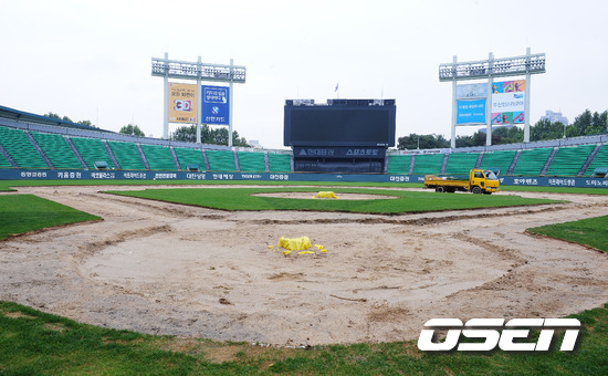 14일 오후 서울 잠실야구장에서 그라운드의 흙을 걷어내고 새 흙으로 교체 작업을 진행하고 있다. 지난 9월 26일 환경보건시민센터가 서울 잠실 등 국내 5개 야구장의 홈베이스와 주루 등에서 1급 발암물질인 석면이 검출 됐다고 발표한 가운데 잠실야구장은 지난 7일부터 교체를 시작해 한국시리즈 직전인 22일까지 작업을 끝낼 예정이다./jpnews@osen.co.kr