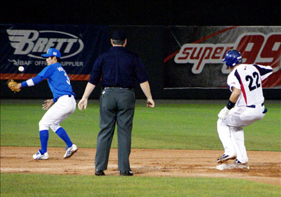 한국 야구월드컵 대표팀이 파나마에 5-4로 승리하며 더블헤더 전적 1승 1패를 기록했다. 천보성(한양대) 감독이 이끄는 한국 대표팀은 14일(한국시간) 파나마 아과둘세의 레몬 칸테라 야구장에서 열린 제39회 야구월드컵 2라운드 파나마와의 경기에서 6회 터진 최주환(상무)의 역전 2타점 적시타에 힘입어 5-4로 승리를 거뒀다. 우천 연기로 인해 더블헤더로 치러진 이날 경기는 대회 규정에 따라 7회까지만 경기를 진행했다. 한국 대표팀은 앞선 캐나다와 경기에선 0-4로 패배했다. 이어진 파나마전 승리로 2라운드 전적 2승 4패를 기록하게 됐다. 한국 선발 나성범(연세대)은 1회 1사 후 파나마에 솔로포를 허용했다. 이어 2회에도 한국 대표팀은 야수 선택으로 한 점 더 실점했다. 3회 반격에 나선 한국 대표팀은 1사 후 이어진 3연속 안타로 한 점을 만회하는 데 성공했다. 하지만 5회 두 번재 투수 이창호(상무)가 솔로포를 허용해 1-3으로 점수가 벌어졌다. 한국은 6회 저력을 발휘해 역전에 성공햇다. 이지영(상무)의 홈런으로 동점을 이룬 뒤 볼넷 2개와 도루로 만든 2사 2,3루에서 최주환이 좌익수 앞 2타점 역전 적시타를 기록하며 경기를 5-3으로 뒤집었다. 7회 마지막 수비에서 한국은 세 번째 투수 문승원(고려대)이 2사 1,2루에서 적시타를 허용해 한 점 차까지 쫒기자 윤지웅(넥센)을 마운드에 올렸다. 그리고 윤지웅은 좌익수 뜬공으로 경기를 마무리했다. cleanupp@osen.co.kr IBAF 홈페이지.