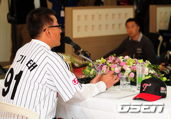 LG 트윈스 김기태 신임 감독이 14일 오후 서울 잠실구장에서 취임 기자간담회를 가졌다. 김기태 감독이 질문에 답을 하고 있다. LG는 박종훈 전 감독의 자진사퇴로 공석이 된 사령탑 자리에 김기태 신임감독을 선임한다고 지난 7일 밝혔다. LG 제16대 감독으로 선임된 김 신임감독은 1969년생으로 만 42세 젊은피라는 점이 가장 큰 특징이다. 분위기 쇄신이 절실한 LG는 젊은피에게 팀 재건이라는 중책을 맡겼다. 한편 LG 트윈스(대표이사 전진우)는 김기태 감독과 계약기간 3년, 계약금 2억원, 연봉 2억원 등 3년간 총 8억원에 계약했다./jpnews@osen.co.kr