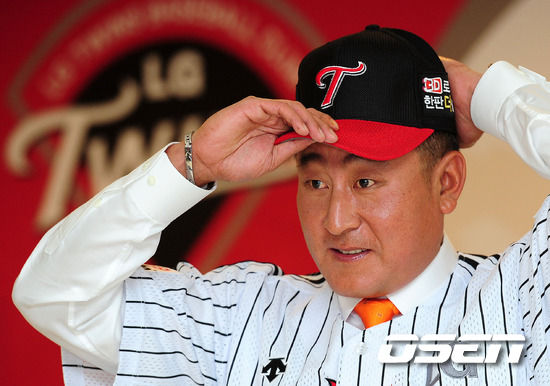 LG 트윈스 김기태 신임 감독이 14일 오후 서울 잠실구장에서 취임 기자간담회를 가졌다. 김기태 감독이 모자를 쓰며 포토타임을 갖고 있다. LG는 박종훈 전 감독의 자진사퇴로 공석이 된 사령탑 자리에 김기태 신임감독을 선임한다고 지난 7일 밝혔다. LG 제16대 감독으로 선임된 김 신임감독은 1969년생으로 만 42세 젊은피라는 점이 가장 큰 특징이다. 분위기 쇄신이 절실한 LG는 젊은피에게 팀 재건이라는 중책을 맡겼다. 한편 LG 트윈스(대표이사 전진우)는 김기태 감독과 계약기간 3년, 계약금 2억원, 연봉 2억원 등 3년간 총 8억원에 계약했다./jpnews@osen.co.kr