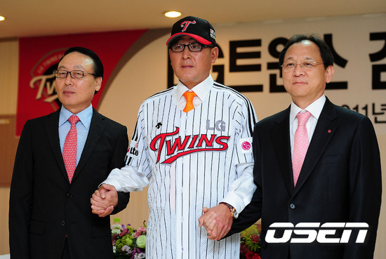 LG 트윈스 김기태 신임 감독이 14일 오후 서울 잠실구장에서 취임 기자간담회를 가졌다. 김기태 감독이 전진우 대표, 백순길 단장과 손을 잡고 포토타임을 갖고 있다. LG는 박종훈 전 감독의 자진사퇴로 공석이 된 사령탑 자리에 김기태 신임감독을 선임한다고 지난 7일 밝혔다. LG 제16대 감독으로 선임된 김 신임감독은 1969년생으로 만 42세 젊은피라는 점이 가장 큰 특징이다. 분위기 쇄신이 절실한 LG는 젊은피에게 팀 재건이라는 중책을 맡겼다. 한편 LG 트윈스(대표이사 전진우)는 김기태 감독과 계약기간 3년, 계약금 2억원, 연봉 2억원 등 3년간 총 8억원에 계약했다./jpnews@osen.co.kr