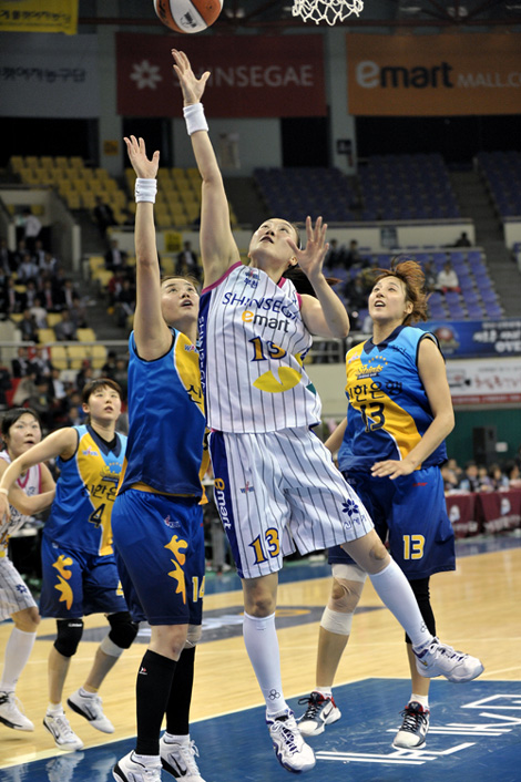 개막부터 이변이 일어났다. 부천 신세계가 여자프로농구 최강으로 불리는 안산 신한은행에 패배를 안겼다. 부천 신세계가 14일 저녁 부천실내체육관에서 열린 신세계이마트 2011~2012 여자프로농구 개막전에서 신한은행을 상대로 79-70으로 승리했다. 이날 신세계의 승리를 이끈 주역은 '김군' 김정은(24). 특유의 감각적인 슛으로 신한은행의 수비를 허물었다. 30점이라는 기록이 말하듯 전반 내내 신들린 듯한 슈팅을 선보였던 김정은은 특히 승부처였던 4쿼터에서 돋보이는 활약을 선보였다. 64-64 동점인 상황에서 7점을 내리 기록하며 신한은행의 추격 의지를 끊어낸 것. 김정은의 활약으로 기세가 오른 신세계는 박하나가 경기 종료 1분여를 남기고 승부에 쐐기를 박는 3점포를 터트렸다. 당황한 신한은행도 강영숙을 중심으로 반격에 나섰지만, 김정은에게 다시 득점을 허용하고 말았다. 여기에 김지윤이 3점 슛을 추가했다. 신세계가 사실상 승부를 결정짓는 순간이었다. 임달식 신한은행 감독은 경기가 끝난 뒤 "막바지 김정은에게 너무 쉽게 득점을 허용한 것이 패인이었다. 개막전 패배는 처음이다"고 고개를 숙였다. stylelomo@osen.co.kr WKBL 제공.