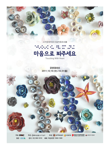 오는 19일부터 31일까지 서울아트센터 공평갤러리에서 시각장애학생 미술작품초대전시회 '마음으로 봐주세요'가 열린다. MBC (주)문화방송이 주최하고 (사)동의난달운숙미술회가 주관하는 시각장애학생 미술작품초대전시회 '마음으로 봐주세요'는 장애에 대한 편견을 넘어 그간 시각 예술 중심의 미술 전시회에서 소외됐던 시각장애학생들의 작품을 전시하고자 마련됐다. 인천혜광학교, 청주맹학교, 충주성모학교의 시각장애 학생들이 만든 미술작품 80점과 제작과정을 담은 영상을 선보이게 되며, 수익은 각 학교에 기부된다. 이번 전시회의 관계자는 "시각장애를 지닌 학생들의 미술적 재능을 일깨우고, 눈이 아닌 다양한 방식으로 감정을 표현하고 나눌 수 있는 기회를 될 것"이라며, "사회적인 관심을 통해 장애학생들에 대한 미술교육 열의를 높이고 다양한 계층이 소통하는 전시문화 발전에 기여하길 바란다"고 전했다. 이어 "시각에 의존해 살아가는 많은 사람들이 시각을 제외한 감각으로 만들어진 미술 작품을 직접 만지고 느끼면서, 장애인과 비(非)장애인이 마음으로 소통하는 기회가 되길 기대한다"고 덧붙였다. 부대행사로는 충주성모학교 개막식 핸드벨 연주, 점자 스티커 및 휴대폰 고리 만들기 체험, 시각장애관련 자료 배포(선착순), 시각장애 체험 등이 있다. 한편 이번 전시회에서 판매된 전시 작품의 수익금은 작품을 만든 시각장애 학생에게 교육비로 전달될 예정이다. 자세한 내용은 홈페이지(blog.naver.com/mbcheart)를 통해 확인할 수 있다. silver11@osen.co.kr