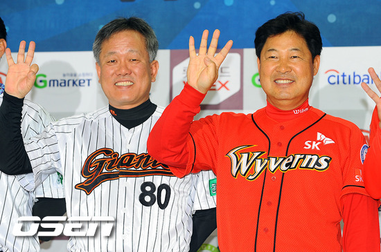 15일 오후 부산 사직구장 내 특설무대에서 열린 '2011 롯데카드 프로야구 포스트시즌 플레이오프 미디어데이'에서 롯데 양승호 감독과 SK 이만수 감독대행이 손가락으로 포즈를 취하고 있다. 이날 미디어데이에서 롯데는 양승호 감독과 송승준, 강민호가 SK는 이만수 감독대행과 박정권, 최정이 참석했다. 한편 2011 롯데카드 프로야구 플레이오프 1차전은 16일 오후 2시 부산 사직야구장서 열린다./ soul1014@osen.co.kr