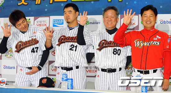 15일 오후 부산 사직구장 내 특설무대에서 열린 '2011 롯데카드 프로야구 포스트시즌 플레이오프 미디어데이'에서 롯데 강민호가 포토타임때 눈치를 살피며 포즈를 취하고 있다. 이날 미디어데이에서 롯데는 양승호 감독과 송승준, 강민호가 SK는 이만수 감독대행과 박정권, 최정이 참석했다. 한편 2011 롯데카드 프로야구 플레이오프 1차전은 16일 오후 2시 부산 사직야구장서 열린다./ soul1014@osen.co.kr