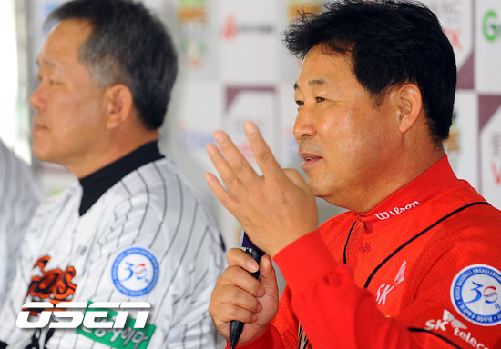 15일 오후 부산 사직구장 내 특설무대에서 열린 '2011 롯데카드 프로야구 포스트시즌 플레이오프 미디어데이'에서 SK 이만수 감독대행이 소감을 말하고 있다. 이날 미디어데이에서 롯데는 양승호 감독과 송승준, 강민호가 SK는 이만수 감독대행과 박정권, 최정이 참석했다. 한편 2011 롯데카드 프로야구 플레이오프 1차전은 16일 오후 2시 부산 사직야구장서 열린다./ soul1014@osen.co.kr