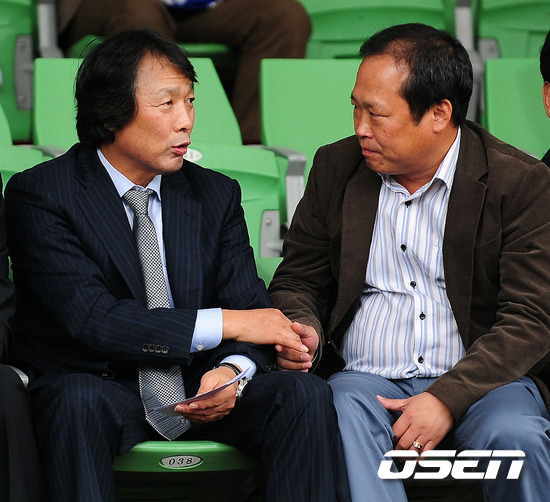 15일 오후 성남탄천종합운동장서 열린 '2011 하나은행 FA컵' 성남 일화와 수원 삼성의 결승전에서 경기를 관전하기 위해 경기장을 찾은 조광래 국가대표팀 감독이 박지성의 아버지 박성종을 만나 악수를 나누고 있다. 지난해 아시아축구연맹 챔피언스리그 정상에 올랐던 성남은 올해 정규리그에서의 부진을 FA컵 우승으로 씻어낼 각오. 특히 K리그서 6강 플레이오프 진출이 사실상 힘겨운 10위인 성남은 아시아 챔피언스리그 진출권이 주어지는 FA컵에 모든 것을 걸었다. 지난 25일 전남 전에서 왼쪽 무릎 인대에 경미한 파열의 부상을 당한 성남의 김정우가 이 경기 복귀 예정이며 성남의 장신 공격수 라돈치치는 지난 2009년 수원과의 FA컵 결승전 승부차기 패배에 대해설욕을 다짐하고 있다. 이에 수원은 FA컵 사상 최초 3년 연속 정상 정복을 노리고 있다. 수원은 특히 지난 7월 입단해 11경기에서 7골을 넣은 스테보와 주장 염기훈의 한 방에 기대를 걸고 있다. 수원의 에이스 염기훈은 지난 해 FA컵 MVP를 차지하며 수원의 2연패를 이끌었으며 3연패 도전의 핵심적인 선수로 간주된다. 특히 이번 경기에서 승리와 함께 꼭 골을 넣어 2년 연속 MVP를 받겠다는 각오를 밝혀 관심거리다. 프로와 아마를 총 망라한 축구계의 잔치인 FA컵, 그 우승팀은 한국 축구의 지존이라는 명예와 우승상금 2억 원, 그리고 내년도 아시아축구연맹 챔피언스리그 출전권을 얻게 된다. / rumi@osen.co.kr