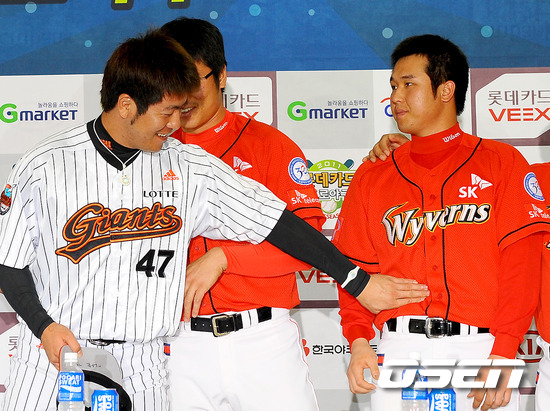 15일 오후 부산 사직구장 내 특설무대에서 열린 '2011 롯데카드 프로야구 포스트시즌 플레이오프 미디어데이'에서 롯데 강민호와 SK 최정이 장난치고 있다. 이날 미디어데이에서 롯데는 양승호 감독과 송승준, 강민호가 SK는 이만수 감독대행과 박정권, 최정이 참석했다. 한편 2011 롯데카드 프로야구 플레이오프 1차전은 16일 오후 2시 부산 사직야구장서 열린다./ soul1014@osen.co.kr