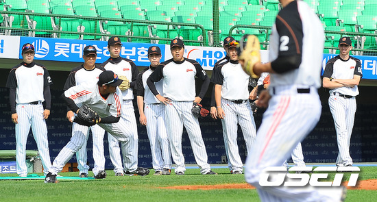 플레이오프 1차전을 하루 앞둔 15일 오후 부산 사직구장에서 진행된 롯데 투수들이 번트대비 훈련을 하고 있다. 훈련에 앞서 진행된 플레이오프 미디어데이에서 롯데 양승호 감독은 장원준을 선발투수로 내세웠고, SK 이만수 감독대행은 김광현을 선발투수로 내세워 혈전을 예고했다. 2011 롯데카드 플레이오프 1차전은 16일 오후 2시 부산 사직구장서 열린다. /soul1014@osen.co.kr