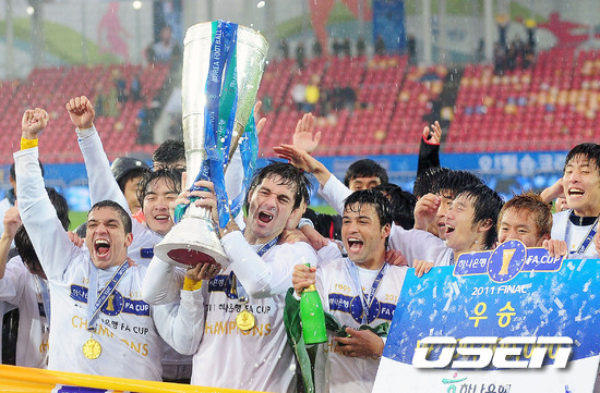 15일 오후 성남탄천종합운동장서 열린 '2011 하나은행 FA컵' 성남 일화와 수원 삼성의 결승전에서 후반 32분 터진 조동건의 헤딩골에 힘입어 1-0으로 승리했다. 경기를 마치고 성남 선수들이 트로피를 들고 환호하고 있다. 1999년 천안 일화 시절 FA컵 우승을 달성한 성남은 12년 만에 두 번째 우승을 거뒀다. 또한 2009년 결승서 수원에 승부차기 끝에 패한 것을 설욕했다. 조동건은 경기 후 MVP에 선정돼 300만원의 상금과 트로피를 받았다. 올 시즌 중반 라돈치치가 팀에 복귀하면서 출전 시간이 줄어든 조동건은 가장 극적인 골을 성공시키며 성남의 중심 선수로 우뚝 섰다. 한편, 지도자상은 신태용 감독과 김도훈 코치에게 돌아갔고 FA컵 득점왕은 고슬기(울산 현대, 4골)가 차지했다. / rumi@osen.co.kr