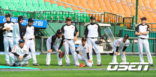 플레이오프 1차전을 하루 앞둔 15일 오후 부산 사직구장에서 진행된 롯데 투수들이 번트대비 훈련을 하고 있다. 훈련에 앞서 진행된 플레이오프 미디어데이에서 롯데 양승호 감독은 장원준을 선발투수로 내세웠고, SK 이만수 감독대행은 김광현을 선발투수로 내세워 혈전을 예고했다. 2011 롯데카드 플레이오프 1차전은 16일 오후 2시 부산 사직구장서 열린다. /soul1014@osen.co.kr