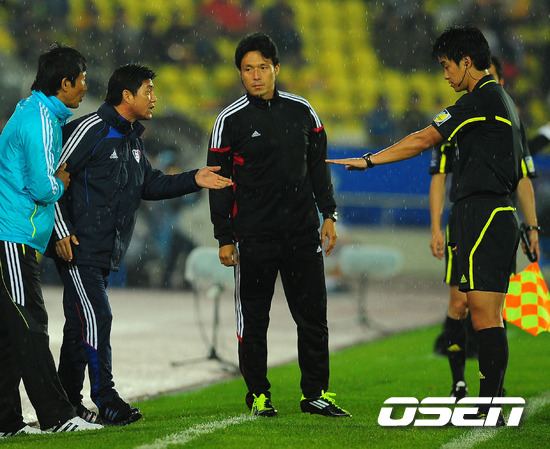 15일 오후 성남탄천종합운동장서 열린 '2011 하나은행 FA컵' 성남 일화와 수원 삼성의 결승전에서 후반 32분 터진 조동건의 헤딩골에 힘입어 1-0으로 승리했다. 후반 수원 윤성효 감독이 심판에게 강하게 항의하고 있다. 1999년 천안 일화 시절 FA컵 우승을 달성한 성남은 12년 만에 두 번째 우승을 거뒀다. 또한 2009년 결승서 수원에 승부차기 끝에 패한 것을 설욕했다. 조동건은 경기 후 MVP에 선정돼 300만원의 상금과 트로피를 받았다. 올 시즌 중반 라돈치치가 팀에 복귀하면서 출전 시간이 줄어든 조동건은 가장 극적인 골을 성공시키며 성남의 중심 선수로 우뚝 섰다. 한편, 지도자상은 신태용 감독과 김도훈 코치에게 돌아갔고 FA컵 득점왕은 고슬기(울산 현대, 4골)가 차지했다. / rumi@osen.co.kr
