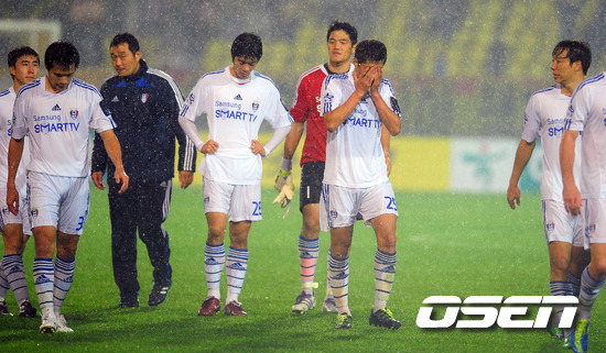 15일 오후 성남탄천종합운동장서 열린 '2011 하나은행 FA컵' 성남 일화와 수원 삼성의 결승전에서 후반 32분 터진 조동건의 헤딩골에 힘입어 성남이 1-0으로 승리했다. 경기를 마치고 수원 선수들이 아쉬워하고 있다. 1999년 천안 일화 시절 FA컵 우승을 달성한 성남은 12년 만에 두 번째 우승을 거뒀다. 또한 2009년 결승서 수원에 승부차기 끝에 패한 것을 설욕했다. 조동건은 경기 후 MVP에 선정돼 300만원의 상금과 트로피를 받았다. 올 시즌 중반 라돈치치가 팀에 복귀하면서 출전 시간이 줄어든 조동건은 가장 극적인 골을 성공시키며 성남의 중심 선수로 우뚝 섰다. 한편, 지도자상은 신태용 감독과 김도훈 코치에게 돌아갔고 FA컵 득점왕은 고슬기(울산 현대, 4골)가 차지했다. / rumi@osen.co.kr
