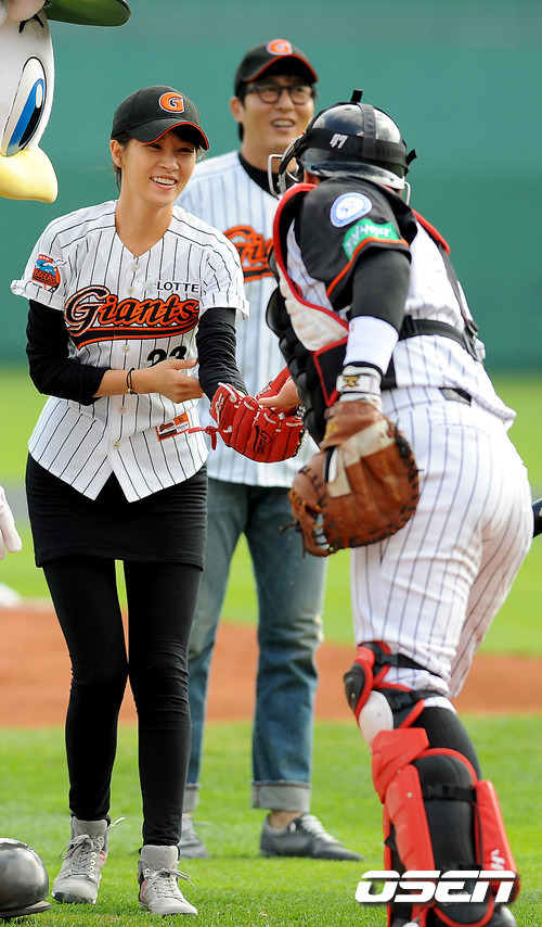 16일 오후 부산 사직구장서 열린 2011 롯데카드 프로야구 플레이오프 1차전 롯데 자이언츠와 SK 와이번스의 경기 전 시구 시타를 마친 배우 김선아가 롯데 강민호 포수에게 시구공을 건네받고 있다. 롯데는 예상대로 가장 컨디션이 좋았던 장원준을 그대로 PO 1차전 선발로 내세웠고, 준플레이오프를 4차전으로 끝내면서 전력을 아낀 SK는 김광현을 1차전 선발 마운드에 올렸다. 롯데는 양승호 감독이 시리즈를 3연승으로 끝내겠다는 자신감을 나타냈고, SK는 준PO에서 먼저 1승을 내주고 3연승으로 리버스 스윕을 이끈 상승세를 바탕으로 치열한 경기가 예상된다. / soul1014@osen.co.kr
