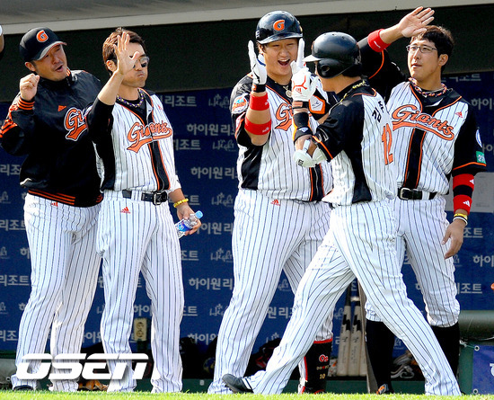 16일 오후 부산 사직구장서 열린 2011 롯데카드 프로야구 플레이오프 1차전 롯데 자이언츠와 SK 와이번스의 경기 1회말 롯데 선두타자 김주찬이 선취 솔로홈런을 날리고 동료들의 축하를 받고 있다 . 롯데는 예상대로 가장 컨디션이 좋았던 장원준을 그대로 PO 1차전 선발로 내세웠고, 준플레이오프를 4차전으로 끝내면서 전력을 아낀 SK는 김광현을 1차전 선발 마운드에 올렸다. 롯데는 양승호 감독이 시리즈를 3연승으로 끝내겠다는 자신감을 나타냈고, SK는 준PO에서 먼저 1승을 내주고 3연승으로 리버스 스윕을 이끈 상승세를 바탕으로 치열한 경기가 예상된다. / soul1014@osen.co.kr