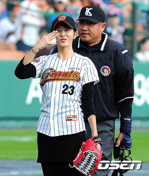 2011 롯데카드 프로야구 플레이오프 1차전시구로 나선 김선아가 팬들에게 손키스를 날리고 있다. 16일 부산사직구장에서 롯데 자이언츠와 SK 와이번스의 플레이오프 1차전 경기가 벌어졌다. 롯데는 예상대로 가장 컨디션이 좋은 장원준을 그대로 PO 1차전 선발로 내세웠고, 준플레이오프를 4차전으로 끝내면서 전력을 아낀 SK는 김광현을 1차전 선발 마운드에 올렸다. 롯데는 양승호 감독이 시리즈를 3연승으로 끝내겠다는 자신감을 나타냈고, SK는 준PO에서 먼저 1승을 내주고 3연승으로 리버스 스윕을 이끈 상승세를 바탕으로 치열한 경기가 예상된다. /spjj@osen.co.kr