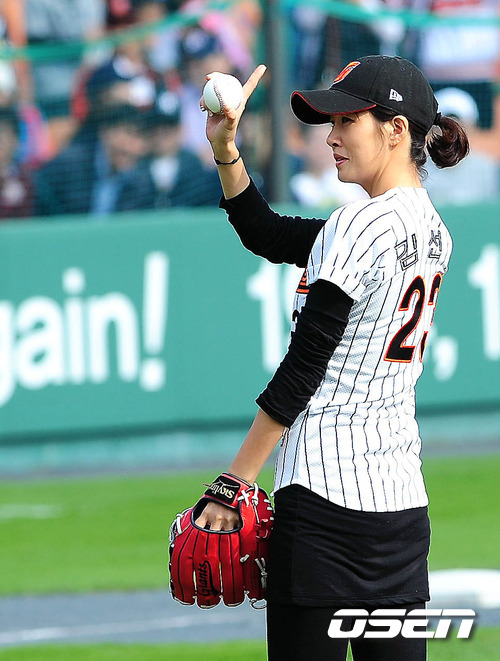 2011 롯데카드 프로야구 플레이오프 1차전 시구에 나선 김선아가 보크를 범하고 한번만 더 하는 제스쳐를 취하고 있다. 16일 부산사직구장에서 롯데 자이언츠와 SK 와이번스의 플레이오프 1차전 경기가 벌어졌다. 롯데는 예상대로 가장 컨디션이 좋은 장원준을 그대로 PO 1차전 선발로 내세웠고, 준플레이오프를 4차전으로 끝내면서 전력을 아낀 SK는 김광현을 1차전 선발 마운드에 올렸다. 롯데는 양승호 감독이 시리즈를 3연승으로 끝내겠다는 자신감을 나타냈고, SK는 준PO에서 먼저 1승을 내주고 3연승으로 리버스 스윕을 이끈 상승세를 바탕으로 치열한 경기가 예상된다. /spjj@osen.co.kr