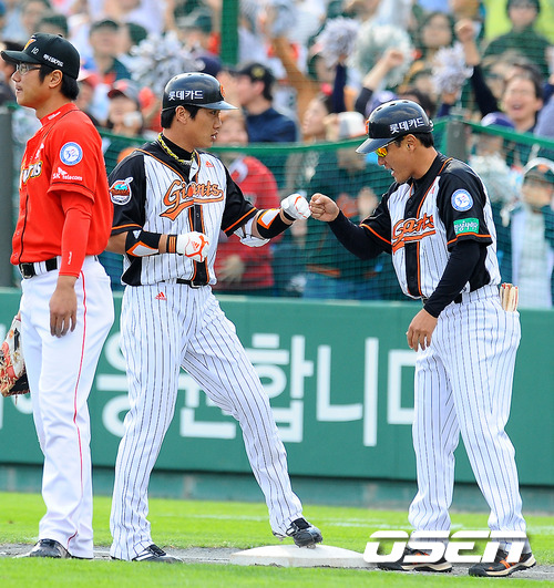 16일 오후 부산 사직구장서 열린 2011 롯데카드 프로야구 플레이오프 1차전 롯데 자이언츠와 SK 와이번스의 경기 2회말 2사 2루 상황에서 롯데 김주찬이 1타점 적시타를 날린후 조원우 코치와 하이파이브를 하고 있다. 롯데는 예상대로 가장 컨디션이 좋았던 장원준을 그대로 PO 1차전 선발로 내세웠고, 준플레이오프를 4차전으로 끝내면서 전력을 아낀 SK는 김광현을 1차전 선발 마운드에 올렸다. 롯데는 양승호 감독이 시리즈를 3연승으로 끝내겠다는 자신감을 나타냈고, SK는 준PO에서 먼저 1승을 내주고 3연승으로 리버스 스윕을 이끈 상승세를 바탕으로 치열한 경기가 예상된다. / soul1014@osen.co.kr
