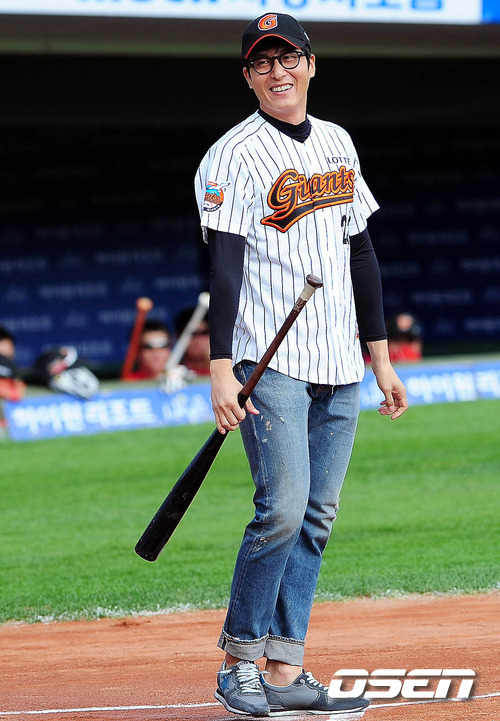 2011 롯데카드 프로야구 플레이오프 1차전 시타를 맡은 김주혁이 김선아의 시구에 헛스윙을 한 후 웃고 있다. 16일 부산사직구장에서 롯데 자이언츠와 SK 와이번스의 플레이오프 1차전 경기가 벌어졌다. 롯데는 예상대로 가장 컨디션이 좋은 장원준을 그대로 PO 1차전 선발로 내세웠고, 준플레이오프를 4차전으로 끝내면서 전력을 아낀 SK는 김광현을 1차전 선발 마운드에 올렸다. 롯데는 양승호 감독이 시리즈를 3연승으로 끝내겠다는 자신감을 나타냈고, SK는 준PO에서 먼저 1승을 내주고 3연승으로 리버스 스윕을 이끈 상승세를 바탕으로 치열한 경기가 예상된다. /spjj@osen.co.kr