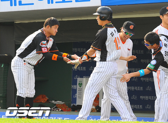 16일 오후 부산 사직구장서 열린 2011 롯데카드 프로야구 플레이오프 1차전 롯데 자이언츠와 SK 와이번스의 경기 2회말 2사 2루 상황 롯데 손아섭의 1타점 적시타때 홈을 밟은 2루 주자 김주찬이 손용석의 환영을 받고 있다 롯데는 예상대로 가장 컨디션이 좋았던 장원준을 그대로 PO 1차전 선발로 내세웠고, 준플레이오프를 4차전으로 끝내면서 전력을 아낀 SK는 김광현을 1차전 선발 마운드에 올렸다. 롯데는 양승호 감독이 시리즈를 3연승으로 끝내겠다는 자신감을 나타냈고, SK는 준PO에서 먼저 1승을 내주고 3연승으로 리버스 스윕을 이끈 상승세를 바탕으로 치열한 경기가 예상된다. / soul1014@osen.co.kr